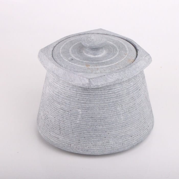 ظروف سنگی معمولاً از سنگ سرپانتین که از خانوادهی کوارتز است تولید میشود. این سنگ وقتی از کوه استخراج میشود به قطعات کوچکتر خرد شده و سپس بر روی دستگاه خراطی بسته میشود. با چرخش دستگاه، صنعتگر شروع به تراشیدن بدنه نموده و بنابر اندازهی سنگ، فرم دیگ یا ظروف دیگر را میسازد. پس از کار خراطی پرداخت نهایی انجام میشود. در مواردی نیز سطح ظروف را صیقلی نموده و روی آن را با تکنیکهای خراش، نقاشی و یا سیاهکاری تزیین مینمایند. استفاده از ظروف سنگی در پخت غذا باعث ایجاد طعم بسیار خوشایند و حفظ ارزش غذایی مواد موجود در آن میشود که این به دلیل پخت آرام و ملایم آن است. در ضمن زیانهای ظروف چدن، تفلون و … را نیز در پی نخواهد داشت چرا که اینگونه ظروف به محض ایجاد خراش احتمال ایجاد واکنش مضر شیمیایی با مواد غذایی را در پی دارند. توجه داشته باشید که داخل دیگ یا ماهیتابه سنگی را قبل از مصرف با روغن خوراکی یا کره چرب نموده و ترجیحاً در آفتاب قرار دهید. این کار را برای دو تا سه بار تکرار نموده و سپس استفاده نمایید. همچنین برای دوام بیشتر، آنها را بدون آب بر روی شعله مستقیم اجاق قرار ندهید. استفاده از آن در فر امکان پذیر است.